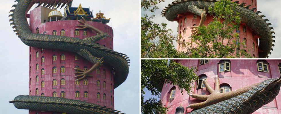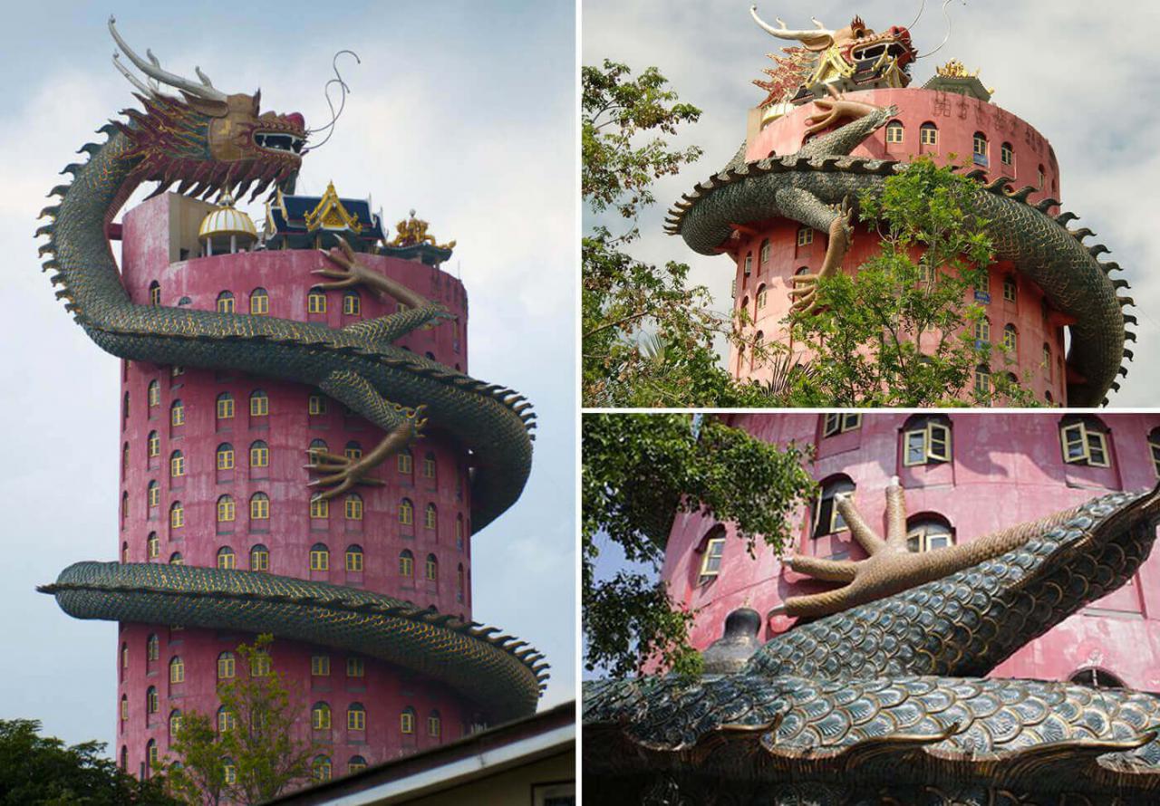 Bên cạnh bức tượng Phật khổng lồ bằng vàng cùng các đền thờ nhỏ thì chùa Wat Samphran còn cực kì ấn tượng bởi sở hữu một tòa tháp màu hồng với hình ảnh một con rồng khổng lồ đang uốn lượn bao quanh từ thân tới đỉnh tháp.
